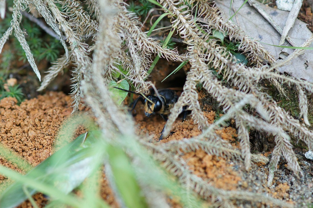 キリギリスの仲間を嬉しそうに抱えて着地。せっせと穴に詰め込んでいた。卵を産み付け、幼虫の餌にするらしい。20頭ほどがそこかしこで飛び回ったり、穴を出入りしたりしていた。可愛い顔をしている。どうせなら一頭採集するんだった。