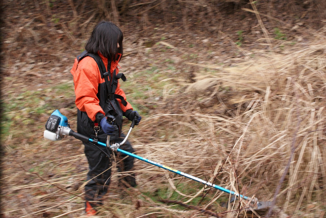 ススキの原を草刈り機で丸裸に。来年茅葺き屋根の補修に使うそう。