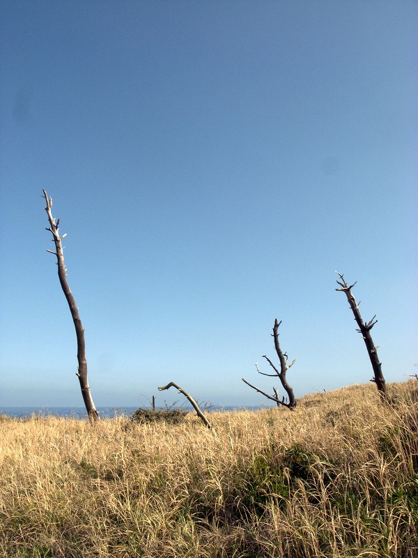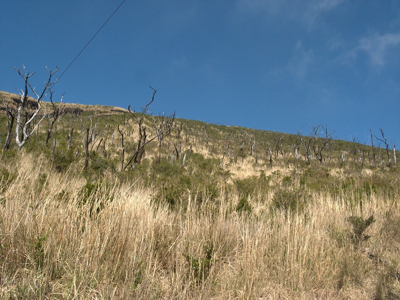 霧がかかることが多い島だが、すっきり晴れると火山ガスで枯死した木々が目立つ。