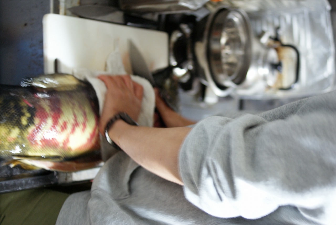 夜は先輩宅でサケを解体しました。写真は私。初めて3枚におろす魚が70cm越えのサケとは思わなかった。頭骨は標本にしようと思ったので、取り出して乾燥中。