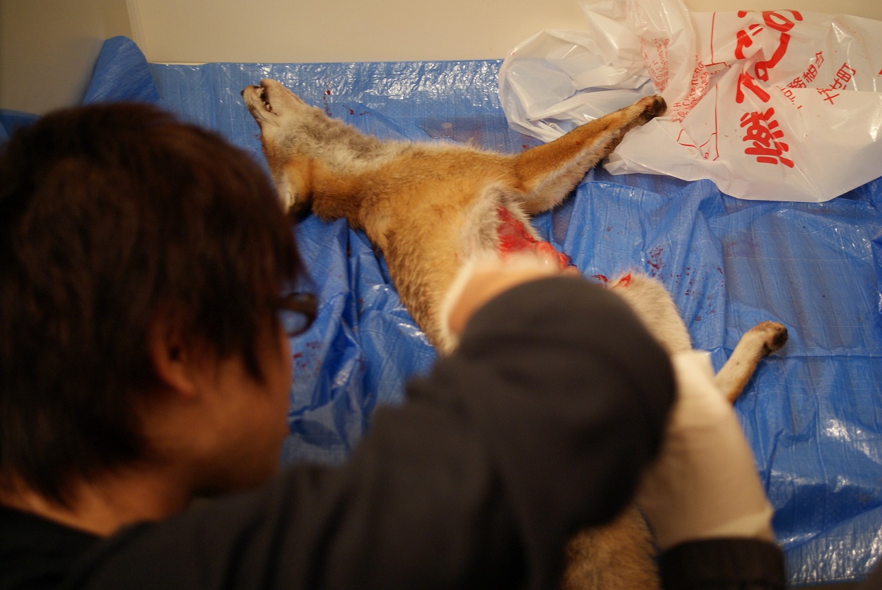 先輩達は後ろでキツネの解体をしていました。毛皮は今なめし液の中です。
