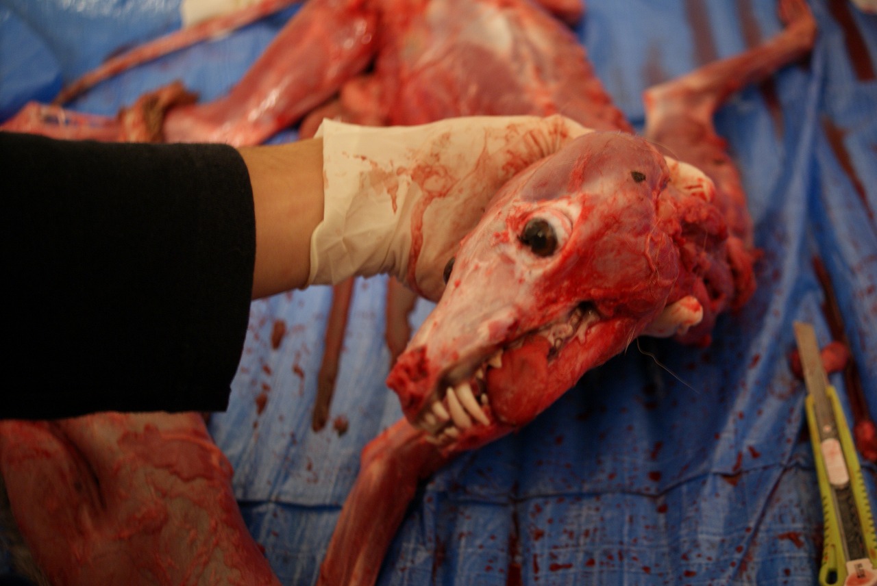 皮を剥ぐと滑稽な表情に。この頭骨も私が標本にするので、今は私の家の冷凍庫の中に放り込んであります。標本製作用の鍋を買ってこなきゃ。